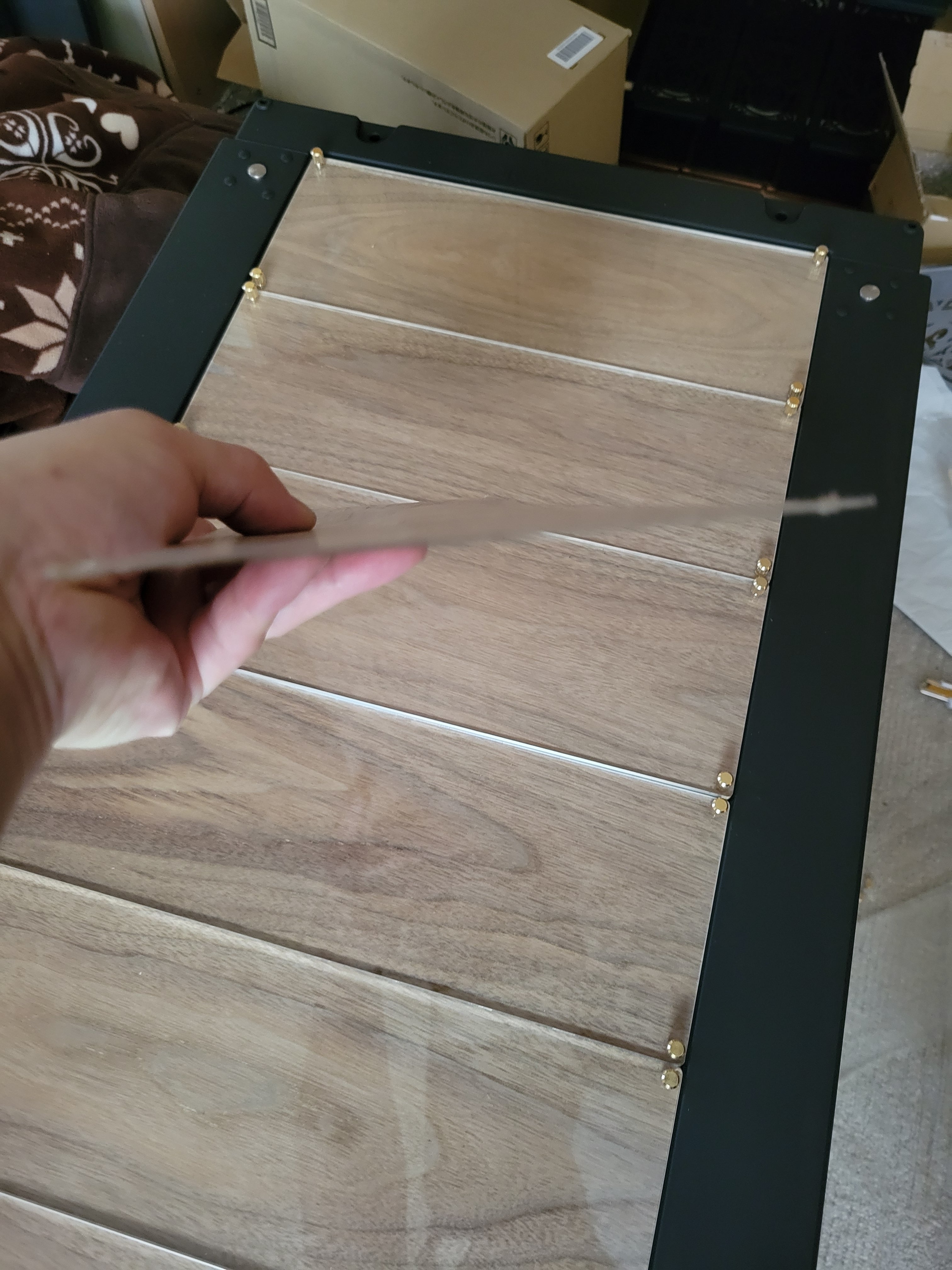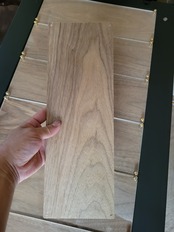 薄いステンレス素材にキルギス模様を肉抜きし、ウォルナットの薄い素材と張り合わせた商品です。